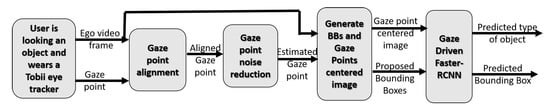 The resolution of the Tobii first-person view camera is full HD (1920 × 1080 p), with a frame rate of 25 frames per second (fps). The real-time requirement for the system in our case means that each processing step of the localization of the object of interest in the glasses-mounted camera in a current video frame has to be lower than 40 ms (the video acquisition rate), and the latency of the whole system should be lower than 100 ms to leave the place for mechanical servoing of the prosthetic arm []. In this work, we do not consider depth estimation, which is a simple regression from eye tracker gaze fixation measures—our focus is on object detection. In the following passages, we present each system block in detail.