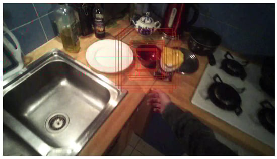 In the current work, 9 bounding boxes (BB) have been generated with different scale and shape factors. The size of a cropped frame is 300 × 300 px []. For the size of BB, we have considered the width and the height between 67 and 223, in accordance with the frame resolution and the typical object sizes in egocentric visual scenes.