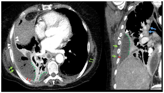 Axial (right) and coronal (left) reconstruction of a 73-year-old patient with empyema on the right side. The arrowheads show increased pleural enhancement of the parietal (costal and mediastinal) and visceral (lung) pleura, consistent with a “split pleura sign” associated with pleural thickening (red dash). Pleural fat stranding (bold green arrows, compared to the normal contralateral side, thin green arrows) and microbubbles (empty arrows) are also present. Pleural empyema on the right side is loculated (green *) in contrast to the simple pleural effusion on the contralateral side. There is reactive hilar and mediastinal lymphadenopathy (blue arrows).