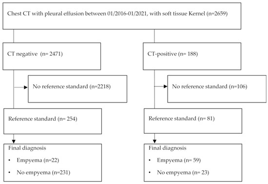 Described pleural CT features and test results (empyema) based on differential diagnosis were extracted by R.S. and assigned to the subsumed CT features. A linguistic weighting of the diagnosis of at least 50% as differential diagnosis (“is likely”; “compatible with”; “diagnosis A versus diagnosis B”) was assessed as a positive test (both for pleural CT features and the diagnosis of empyema). A weighting of less than 50% (“unlikely”/“no evidence of”) was rated as a negative test. Cases with no description were rated as negative (e.g., no split pleural sign if no description of the pleural enhancement was available). Routine assessment of peripleural fat tissue was not done in the radiological reports and therefore could not be extracted.