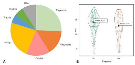 Pathology diagnoses were based either on intra-operative samples (n = 61), biopsies (n = 42), or fine needle aspiration or thoracentesis (n = 231). A total of 82 patients with empyema were identified. In 14 empyema cases, malignant cells were additionally detected in the pathological specimen with known underlying malignancy.