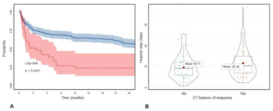 (A). Survival of the patients with (red) and without (blue) CT features of pleural carcinomatosis based on Kaplan-Meier survival analysis. (B). Hospitalization duration in pneumonia patients with and without CT features of empyema.
