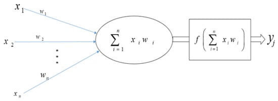Each input has a corresponding weight in an artificial neuron or node.The total of all weighted inputs () is then fed into a nonlinear activation function (f), which translates the preactivation level of the neuron to an output ().The bias terms have been deleted for simplicity. The result ( is then used as an input for the following layer’s node. Numerous activation functions are available, each with a somewhat different mapping of a preactivation level to an output value. The rectifier function is the most often activated function (neurons that employ it are referred to as “rectified linear units” (ReLU)), followed by the hyperbolic tangent function, the sigmoid function, and the softmax function. As seen in Figure 5, the latter is frequently utilized in the output layer to compute the likelihood of multiclass labels.