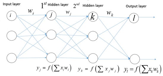 A feedforward multilayer neural network with two classes (also known as a multilayer perception). Each node in one layer is linked to every neuron in the subsequent layer (a fully connected network). The weighted total of the inputs for each neuron j in the first hidden layer is multiplied by a nonlinear function. The output () of this transformation is utilized as the input for the second hidden layer. The information is transferred to the output layer through the network.