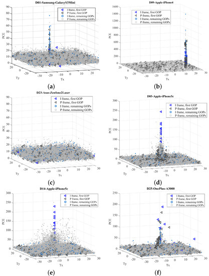 3D scatter plots of PCE in function of correlation peak position of six most representative devices. PCE is evaluated for each frame of all videos available for a given device. Samsung (a), Apple (b,d,e), Asus (c) and OnePlus (f) devices are shown. Non-stabilized (a–c), as well as stabilized (d–f) videos are presented. We also report a case of missed detection (c) at frame level.