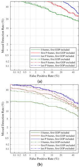 The previous analysis provides useful insights at the level of a single frame. At the video level, we applied Equation (3), and then we performed a binary classification. We describe the performance through Detection Error Trade-off (DET) curves, produced by considering only I frames or only P frames in a given position within the video stream and considering or not the first GOP. We draw them by varying the decision threshold and by calculating the False Positive Rate (i.e., the rate of true negative samples wrongly classified as positive) and the Missed Detection Rate (i.e., the rate of true positive samples that are erroneously classified as negative). Finally, the axes are non-linearly scaled by their standard normal deviates in a logarithmic scale. The DET curves are separately drawn for non-stabilized and stabilized videos (Figure 4a,b respectively). For the sake of visualization, we report results obtained using I frames, the first P frames, or the last P frames only.