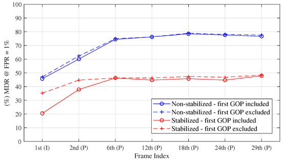 Missed Detection Rate (MDR) at of False Positive Rate (FPR), obtained by considering frames at a different positions within the GOP. In blue, the results for non-stabilized videos, in red for the stabilized ones. Solid lines are obtained by considering all GOPs in a video, dot lines by excluding the first GOP.