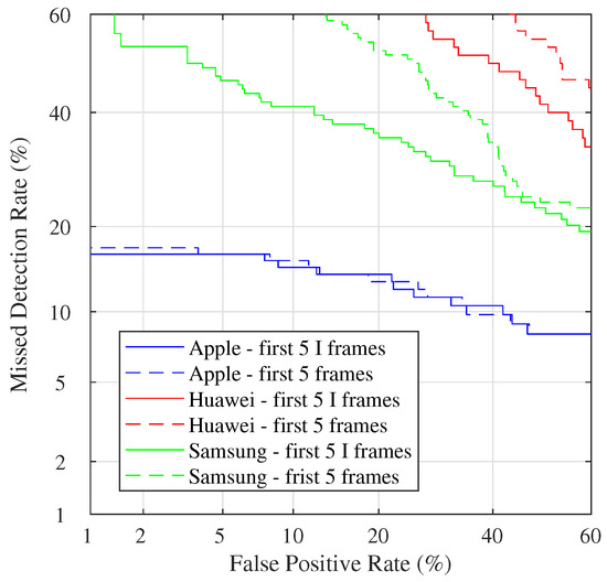 As a the last experiment, we compared two different strategies: the first (suggested in [18]) is to use a very limited number of I frames; the second one is to consider first five video frames, independently from their type. The results are grouped by brands available in VISION (see Figure 6). It is worth to note that performance can strongly vary among different brands. Overall, the detection rate of the Apple brand is the highest. This fact is relevant if we consider that the different behaviors among brands are never considered in most proposed methods. This fact also exposes that methods’ performance can significantly change by adding or removing a few devices from a specific brand. We can fairly notice that the discrimination power is almost the same for Apple devices between the two approaches. At the same time, it is quite worse for Huawei and Samsung models (with a preference for the use of I frames only).