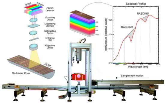 HSI of lake sediment cores is a novel technique rapidly growing in interest, particularly due to its rapid acquisition of ultra-high-resolution datasets. HSI core scanning has utilized cameras operating in the visible and near infrared (VNIR; 400–1000 nm) and short wave infrared (SWIR; 1000–2500 nm) wavelengths to detect sedimentary components and properties such as organic matter [11], sedimentary pigments [12,13,14], minerals [12], particle size [15,16], and sedimentary structures [17,18].