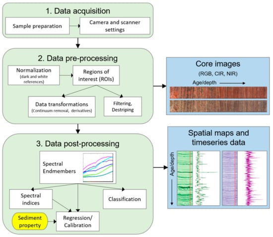 Schematic summary of a typical methodological workflow for hyperspectral imaging analysis of lake sediment cores.