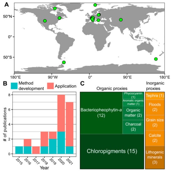 Hyperspectral imaging core scanning provides valuable high-resolution biogeochemical data that can help reveal past environmental conditions and processes. Based on a literature search using Google Scholar and Web of Science, we identified 25 published peer-reviewed studies that included original HSI datasets from lake sediment core scanning (Table S1; Figure 3). HSI data are a primary focus in some studies and complementary in others, providing context for the primary analyses. HSI has been applied to lake sediments from across the globe, with the majority of sites being in Europe. The most common application has been the reconstruction of past aquatic productivity based on the absorbance of chloropigments [12,13,14,43,44,45,47,49,50,51,53,66,73,74,75]. Other sedimentary variables interpreted from HSI include bacteriopheophytin a [6,12,13,43,44,45,47,49,50,51,53,75], phycocyanin [44], bulk organic matter [11,55], aromatic organic matter [44], charcoal [12,62], tephra [54], flood layers [17,18], particle size [15,16], calcite [12,47], and lithogenic minerals [12,45,46]. In the following sections, we discuss three areas in which HSI has supported key scientific insights.