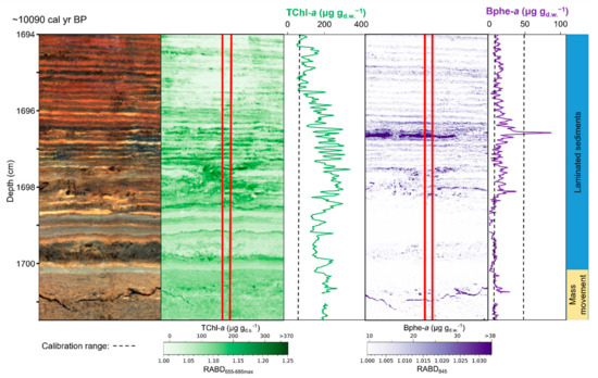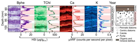 The extremely high spatial resolution of measurement obtained with HSI makes it possible to investigate seasonal scale sedimentation and biogeochemical processes recorded in varved (annually laminated) sediments. This provides a novel tool to study past seasonal-scale environmental phenomena, such as lake mixing regimes or seasonal climate variability. HSI-inferred sedimentary pigments were used to investigate seasonal-scale varve formation processes in Lake Żabińskie (Figure 4) [47]. Seasonal phytoplankton blooms were recorded by HSI-inferred chloropigments (TChl). Additionally, bacteriopheophytin a (Bphe) was used as an indication of lake stratification. Bacteriopheophytin a is a biomarker for anoxygenic phototrophic purple sulfur bacteria, which require both light and anoxic/sulfidic conditions to grow [13,67]. Therefore, the presence of this pigment indicates strong stratification of the water column with a shallow chemocline and extensive hypolimnetic anoxia. The HSI pigment data could be linked to micro-X-ray fluorescence (μXRF) imaging data, which was used to identify periods of spring–summer calcite precipitation (Ca) and fine-particle settling in winter under ice cover (K). Zander et al. [47] used these high-resolution imaging techniques to investigate seasonal deposition over the past 54 years, revealing that recent warming temperatures increased the relative amount of biogenic/authigenic sediments and reduced the relative contribution of lithogenic sediment. This research highlights the possibility of high-resolution seasonal–annual scale climate reconstructions based on varved lake sediments using imaging techniques.
