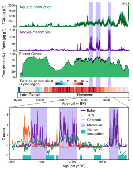 Holocene and Late Glacial (past 15,000 yrs) reconstruction of aquatic productivity and lake mixing from Moossee, Switzerland based on HSI-inferred pigments. Meromixis was inferred from the presence of bacteriopheophytin a based on HSI. Meromictic periods (highlighted in purple shading) occurred during periods of closed forest cover (dashed line in the forest cover plot indicates closed forests with 80% tree pollen) and warm summer temperatures. Human-caused forest openings led to periods of greater lake mixing. Modified from Makri et al. [43]. Summer temperature reconstruction inferred for the Alpine region based on chironomids [78].