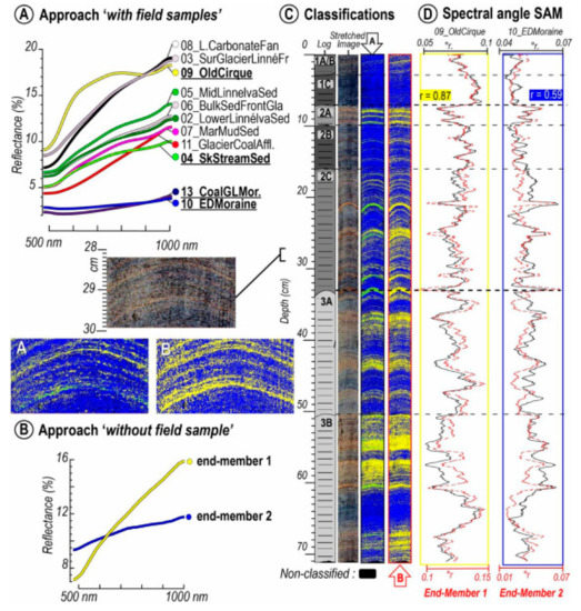 Example of hyperspectral image classification techniques to distinguish sedimentary sources at Lake Linné, Svalbard [55]. (A) Reflectance spectra of rock and sediment samples obtained from the catchment area. (B) Endmember spectra identified in the sediment core. (C) Core image, and classification maps based on similarity to spectra in (A,B,D) Downcore profiles of similarity scores (spectral angle) for endmembers 1 and 2, as well as the field samples most similar to those two endmembers. Endmember 1 is composed of fine-grained clastic sediments, whereas Endmember 2 represents sediments with greater organic matter content, and is similar to field samples taken from coal-rich deposits in the catchment area (13_CoalGLMor and 10_EDMoraine). Reprinted from Van Exem et al. [55] with permission from Elsevier.