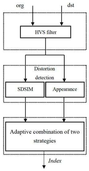 The most apparent distortion (MAD) method was proposed by Larson [16]. In this paper, the author uses two strategies for distortion detection: the first strategy is based on the high-quality image detection strategy, which uses the mean squared error (MSE) to calculate the distortion of visibility. The MSE is the simplest and most widely used full-reference quality metric, which is computed by averaging the squared intensity differences of distorted and reference image pixels. The second detection strategy is based on appearance distortion. The strategy uses standard deviation, skewness, and kurtosis to calculate the distortion of low-quality images. Based on the idea of the MAD algorithm, the proposed algorithm (The execute file is available at https://github.com/donghuilee2022/IQA-for-halftone-image/tree/master, accessed on 12 February 2022) also evaluates the gloss of the image through two strategies. In the first strategy, we remove the HVS processing in the first strategy of MAD and use SDSIM replace MSE to calculate the distortion of visibility. In the second strategy, we only use the standard deviation and skewness related to gloss perception to calculate the appearance distortion. In addition, we also use a new HVS filter to preprocess the image. Finally, the adaptive method proposed in MAD is used to merge two strategies. The details are presented in the following subsections. First, we explain the near-threshold distortions using a method for quantifying perceived distortion, which was used to model the HVS detection. Second, we explain suprathreshold distortion, which was used to model HVS statistical characteristics. Third, we used a parametric method to combine the two modeled perceptual distortions, thereby achieving a single perception of overall distortion. Figure 1 presents a flowchart of the proposed algorithm.