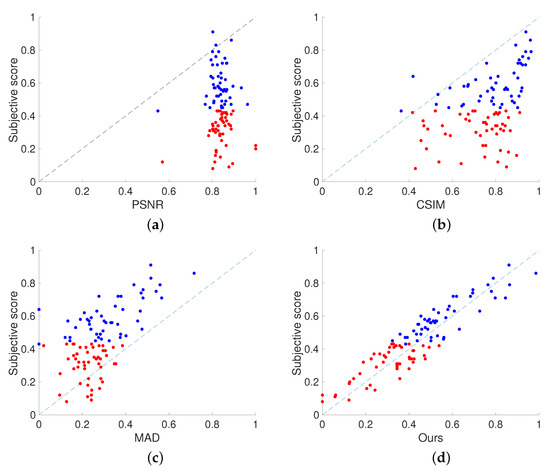 Scatter plots of the PSNR, CSIM, MAD, and proposed metric for test samples halftoned by Floyd: (a) PSNR, (b) CSIM, (c) MAD, and (d) Ours.