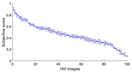The Pearson correlation coefficient (PCC) was the most common measure of predictive performance. Here, we used PCC to calculate the correlation between the observer scores and objective index values. To distinguish the effects of metrics on glossy and non-glossy images, we sorted the subjective data in descending order, and the objective data were sorted accordingly. The first 50 images of the arranged data were classified as non-glossy images, and the rest were classified as glossy images. The former was represented by red points, the latter by blue points. Figure 7 shows the scatter plots of PSNR, CSIM, MAD, and the proposed image glossiness metric for 100 images based on Floyd. In all graphs, each point represented a test image. Figure 8 shows the error bar of the subjective score based on Floyd from the five observers. In Figure 7, the vertical axis represents the subjective ratings of the perceived distortions, and the horizontal axis represents the metrics. As Figure 7 shows, the proposed index evaluated the glossiness correctly compared to other indices. Comparable results were obtained for the other halftone methods.