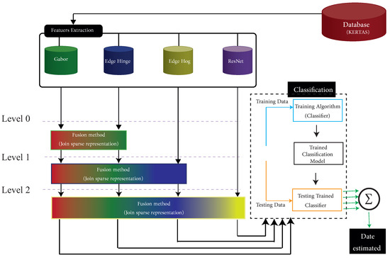 Arabic manuscripts are an important part of Arab and Muslim heritage around the world. National libraries house hundreds of thousands of digital images; however, many documents do not expressly state when they were written. Dating historical documents will assist in linking them to an important event and determining their historical significance. Handwriting styles in Arabic evolved over time. Each Islamic century has its own set of writing scripts, giving the various writing styles distinct characteristics. Some writing styles evolved over centuries, retaining their general characteristics while also incorporating a new set of personalities. The degraded state of the historical documents, as well as the similarity of the writing styles, make it difficult to date the historical document. Several works on manuscript dating were performed, which we will look at in the following section. For instance, the System for Paleography Inspection (SPI) [1] was one of the earliest studies in the field of digital paleography. SPI for Latin documents breaks down the manuscripts into character images. Each new character image is tested against the exciting database using tangent distance and statistical-based algorithms. Despite extracting suitable features in the methods, these methods need to be improved. The combination of the features obtained promising results. However, these methods were traditional and only concatenated the features to feed into the classifier, e.g., [2]. This motivated us to use an effective combination method to fuse the feature. Although a new fusion method can demonstrate better results than a traditional one (with concatenating features), existing noise among the features can affect their accuracy. This paper presents a novel fusion approach by hierarchically considering subsets of the multifeatures. Selecting the subsets puts the approach open to the following research. However, we also explore some of the subsets in the study. A representation of the selected subsets with their corresponding levels included in the suggested approach is presented in Figure 1. Our approach is based on one of the popular fusion methods: the joint sparse representation. Fusion techniques in general, and particularly sparse-representation methods, struggle with unwanted noise when combining features, which affects the final output [3]. Therefore, to avoid that situation, we select subsets of the multifeatures to feed into the method hierarchically rather than simultaneously considering whole features. The main contributions of this paper are defined as follows: