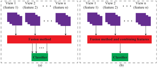 Different structures for multi-feature fusion. (a) multiple views are sent to classifier without reducing them (our approach) (b) Views are reduced into one map.