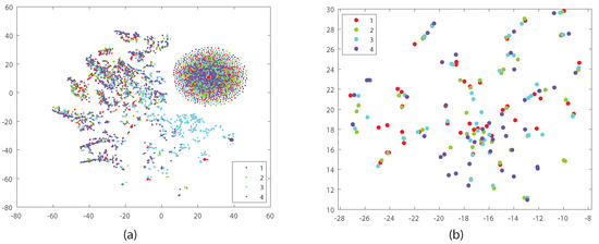 To analyze the learned feature space, we used the t-SNE algorithm [56] with respect to the KERTAS dataset to project 10 samples of the first class onto the two dimensions, as shown in Figure 4. The samples are based on the four views. As shown in Figure 4a, the original data consist of two main parts in the feature space, while our proposed approach (Figure 4b) assigns the features to only one part, which leads the classifier to obtain more accurate results than the method based on concatenation of features.