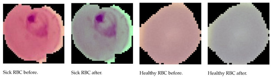All the images have a uniform background, even if different according to the dataset. Indeed, NIH contains only single-cell images surrounded by a black background, while the images of MP-IDB have several blood components with their actual plasma background. Both datasets are organised into classes, healthy or sick, for NIH and the four malaria types for MP-IDB. As it can be seen from Figure 1 and Figure 2, there are many colour variations between the images of both datasets. This condition is undoubtedly due to the different acquisition conditions and from the status of the blood smear [35]. Therefore, it was considered appropriate to apply a preprocessing step to realise a colour balance. Furthermore, for MP-IDB, we created a single image for each parasite from the full-size images. The preprocessing step was designed mainly to adjust the colour components of the images and applied to all the RGB channels, using a colour-balancing technique, through Equation (1), where is the processed component, is the component to be processed, is the average of the average intensities of the three channels and, finally, is the average intensity of the component to be processed. This procedure was carried out on all three channels of the RGB image.