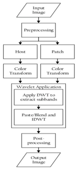 While keeping into account the correspondence of both the components and their sub-bands, each sub-band of B is pasted to the identified place in the corresponding sub-band of A. This pasting may be carried out just by simple cut-out or alpha matting, or even using a gradient transfer such as Poisson image editing, as elaborated in Section 2. Level l inverse DWT is applied to the blended sub-bands from the last step to obtain the Y, Cb, and Cr components of the wavelet-transformed manipulated image.