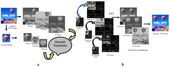 DWT domain tampering. (a) Transforming into DWT domain, (b) Copy/paste and subsequent IDWT.