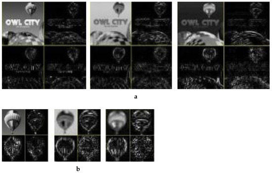 Application of Level 1 Haar’s DWT resulted in four sub-bands (LL, HL, LH and HH) for both A and B, as shown in Figure 7. The LL sub-band (top left in each image) of each component was its low-pass version. The three other sub-bands were high-pass representations.