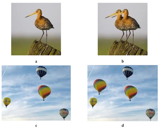 Example Results. (a) Original, (b) Forged, (c) Original (https://upload.wikimedia.org/wikipedia/commons/e/e9/WIM_2004_balloons.jpg (accessed on 8 December 2021)), (d) Forged.
