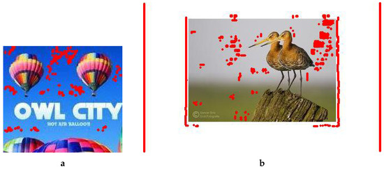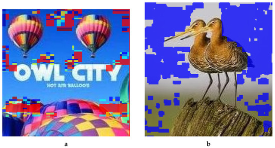 Forgery detection results provided by the authors of Meena’s method. (a) Forged balloon image, (b) Forged birds image (the copyright logo is visible on the tested forged version; for better viewing, a cropped version of the image is used in Figure 5a).