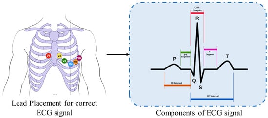 Cardiovascular diseases (CVDs) are the primary cause of death every year. According to the World Health Organization (WHO), approximately 17.9 million people died due to CVD in 2019, which translated as CVDs causing 32% of global deaths. Of these deaths, 85% were due to heart attacks []. A heart attack is caused by the blockage of one or more coronary arteries, whereas other CVDs cause the remaining 15% of the deaths due to cardiac arrhythmia. Cardiac arrhythmia is an irregular heartbeat. ECGs are used to monitor heartbeats. The ECG signal is recorded through electrocardiography in which 12 leads are placed on the body. For correct recording of the ECG, the placement of the leads is very important []. The correct positions of the leads and the components of the ECG signal are shown in Figure 1.