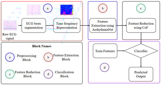 Inspired by this, we propose a novel deep-learning-based framework for classifying cardiac arrhythmia using attention-block-based CNN and the clump of features (CoF). The ECG signal is segmented into beats and converted into a 2D time–frequency domain signal using CWT. The features are extracted using attention-based CNN. After feature extraction, feature reduction is achieved with the help of the CoF model; then, classification is performed using classifiers. The performance of several classifiers is compared.
