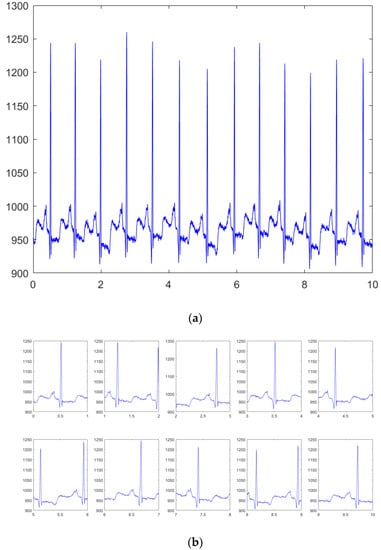 Complete ECG signal with its segmented beats: (a) complete ECG signal; (b) segmented beats.