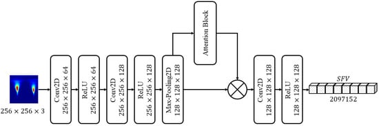 After preprocessing, the features of the 2D representations are extracted with the help of a novel ArrhythmiaNet with an attention block. ArrhythmiaNet consists of three 2D convolutional layers with the rectified linear unit (ReLU) as the activation function, one max-pooling layer, attention block, one flatten layer, and one last fully connected layer. The output of the fully connected layer is called the spatial feature vector. The attention block is explained in Section 3.3.1. The output of this attention block is multiplied with the max-pooling layer of the main ArrhythmiaNet. The purpose of this attention block is to capture global features, as explained in []. The architecture of the ArrhythmiaNet with the attention block is shown in Figure 4.