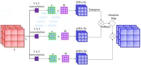 Figure 5 shows the attention block. In the attention block, the input features map denoted by is transformed into three feature spaces, f, g and h. To derive these feature spaces, initially, the input is passed through convolution, and then it is multiplied by the trained weighted matrices W using the following equations.