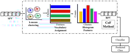After clustering, the histogram of the clustered vocabularies is drawn to derive the RFV. The RFV has the most important features. In feature reduction, the training and testing features are treated separately because the inter-patient paradigm is more strict than the intra-patient paradigm. The CoF method is illustrated in Figure 6.