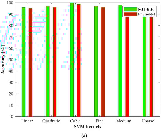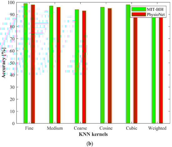 Performance of the different kernels of both classifiers on MIT-BIH and PhysioNet datasets: (a) SVM classifier; (b) kNN classifier.