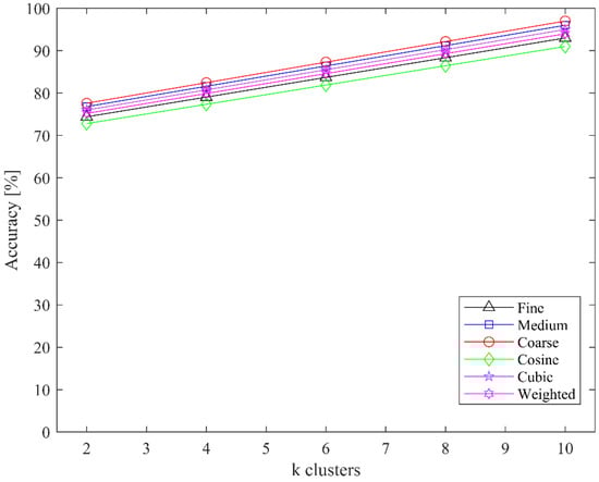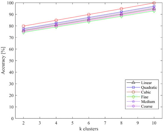 We also evaluated the classification accuracy of both classifiers for the MIT-BIH dataset for different clusters in the CoF module; the highest accuracy was achieved at 10 clusters. The classification accuracies of SVM and kNN for different clusters are shown in Figure 8 and Figure 9, respectively.