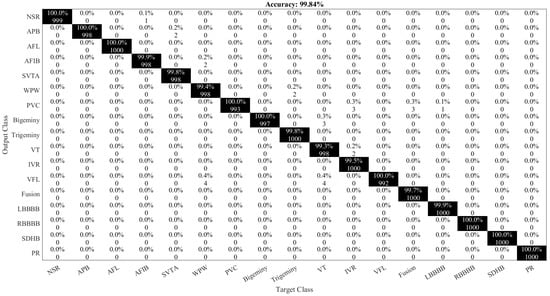 From Table 4, all the CNN-based models which used ECG as 2D signals considered a maximum of eight classes of cardiac arrhythmia, and the maximum accuracy achieved by [] was 99.11%. We have considered seventeen classes of arrhythmia and achieved 99.84%, which outperforms all the existing methods.