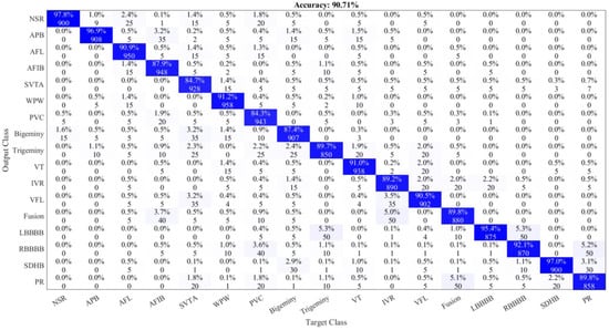 The confusion matrix of ArrhythmiaNet using the SVM classifier is shown in Figure 10.