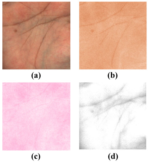 The color of human skin is determined by two main pigments, melanin and hemoglobin [28,29]. The concentration of each pigment varies between individuals as well as between parts of the body. Although there are various techniques to measure the concentration of pigment components in human skin, Tsumura et al. proposed an efficient method using common RGB images [16]. They used independent component analysis to separate the RGB signal into melanin and hemoglobin components. This skin model assumes that the boundaries of each layer of the skin are flat, and that melanin is exclusively present in the epidermis and hemoglobin is exclusively present in the dermis. Considering the light incident on this skin model, it can be divided into surface reflected light, which is reflected on the surface of the skin, and internally reflected light, which is repeatedly absorbed, scattered, and emitted inside the skin. Only internally reflected light is used as an observation signal because the light scattered and absorbed by skin pigment expresses the skin color [28,29].