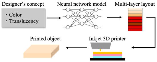 In recent years, the usage of 3D printers has increased in a wide range of fields, such as medicine and dentistry [1,2], for prototyping of automobile parts [3], and for manufacturing of consumer products; they are also now used in general households. In particular, modeling of character figures for general consumers and the reproduction of historical artworks are highly demanded applications in 3D printing. These applications require accurate reproduction of not only shape but also appearance, including color, surface and material properties. Accurate reproduction of appearance in 3D printing is difficult in conventional 3D printing machines that use a limited number of materials; however, since the development of multi-material 3D printers, various studies were conducted on appearance reproduction recently [4].