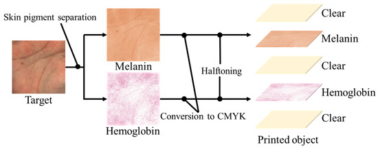 In the present paper, we propose a pipeline for 3D modeling of human skin with multilayered spatial distribution of pigments, using skin images taken by an RGB (red, green, blue) camera. The coloring layer consisted of two layers—the epidermal layer with melanin pigments and the dermal layer with hemoglobin pigment—using a technique called pigment component separation [26]. Conventionally, light scattering simulation methods such as the Monte Carlo method are used to simulate the color of objects with a multi-layered structure [27]. The optimization is expected to be performed by a non-linear optimization technique to reproduce appropriate skin tone; however, it requires huge calculations to obtain the spatial distribution of color on the skin. Therefore, we used a simple light scattering simulation method based on the modified Lambert–Beer law, and extracted the spatial distribution of hemoglobin and melanin from the skin color image [26]. The extracted spatial distribution of hemoglobin and melanin were converted to CMYK values by a color patch-based method and used in the 3D printer while empirically inserting the clear layer to reproduce the skin appropriately. The clear layer was made with a clear ink that is a varnish-like ink that does not contain pigments. We used Mimaki’s clear ink (SPC-0659CL, Mimaki Engineering, Nagano, Japan) in this study. In contrast to most research in this area, which is limited to synthetic inputs, we propose an end-to-end reproduction method for real skin. It is also novel in that it uses pigment concentration to represent skin tone.