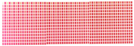 Because the color patches were made using an inkjet 3D printer, CMYK values were required to fabricate the color layer. The 30 pigment concentrations can be expressed as RGB values. Therefore, we transformed the color space with the ICC profile (Japan Color 2011, coated). In addition, halftoning was performed for the inkjet printing. The largest dot size was used to prevent unevenness in the stacking process. An error diffusion method (Floyd–Steinberg) was used for dithering to reduce the quantization error due to halftoning. The coefficients of error diffusion were 7/16, 3/16, 5/16 and 1/16 for the right neighbor, left bottom, true bottom and right bottom, respectively. Through these processes, 900 color patches with two pigment layers, as shown in Figure 5, were created. It can be seen that the skin tone changes significantly according to the change in pigment concentration. These patches cover a wide range of skin tones, from hypopigmented to hyperpigmented skin tones.