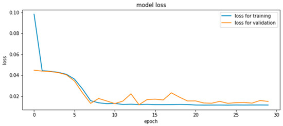 Here, we present the results of the estimation of CMYK values using the neural network. The structure of the model is shown in Figure 7. Two models with the same structure in each of the melanin and hemoglobin layers were constructed. The inputs were RGB values derived from the pigment concentration, and the outputs were CMYK values for printing. This was obtained by capturing 900 color patches and extracting the pigment components, and all 900 data points were used for training. The middle layer was the fully connected layer, which had 20, 30, and 20 neurons from the input side to the output side. ReLU (rectified linear unit) was used for the activation function and Adam was used for the optimization algorithm. As shown in the reference [33], it is common in the field of neural networks to use ReLU, and therefore we used ReLU empirically. We think it is required to compare with other activation functions in the future. The learning and validation errors for the 30-epoch learning are shown in Figure 8. The accuracy of this method was verified by leave-one-out cross-validation, and the RMSE was 0.035. The validation error during training was small around epoch 13; however, the error due to leave-one-out cross-validation was smallest at epoch 30.