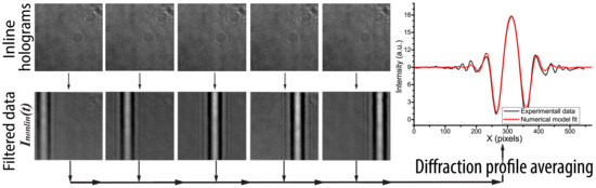 Examples of initial inline digital holograms before (top row) and after (bottom row) image filtration. The plot on the right side demonstrates the experimental profile and its fitting using numerically simulated data.