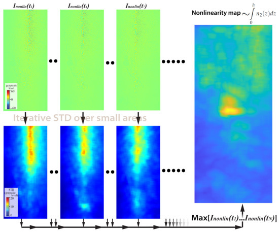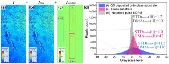 where P is the power density of the pump pulse and h is the total thickness of the object. In order to do this, one can evaluate the value inside a local rectangular area and compare it with the value detected in the ‘reference’ area, corresponding to the pure glass substrate with a previously found nonlinear refractive index of . However, both maximum and minimum intensity values within these rectangular local areas (see examples highlighted in blue and red in Figure 3c) are subject to thet high impact of shot noise, so to increase the robustness of the approach, we suggest analyzing the whole statistical distribution of the intensity values within the area and evaluating its standard deviation, which is less susceptible to random errors: