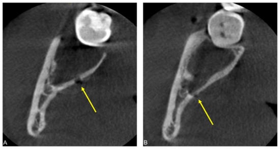 Postoperative cone-beam computed tomography (CBCT) scan of a patient complaining of persistent numbness of the right side of the tongue two weeks after bilateral MTM surgery. Axial CBCT image reconstructions (A,B) visualize two possible iatrogenic defects of the lingual cortical bone: a spherical lesion at the level of the former crown and a linear defect distal to the level of the former cementoenamel junction of the MTM.