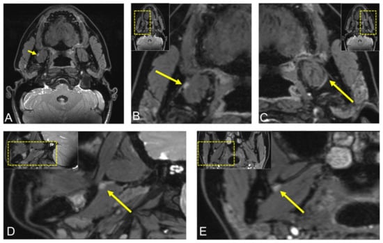 Postoperative visualization of the lingual nerve (LN) using 3D double-echo steady-state (3D-DESS) MRI in the same patient. (A,B) Axial, (D) sagittal, (E) coronal reconstruction of the region of interest displaying the LN asymmetry throughout its course through the infratemporal fossa, with an LN hyperintense nodular lesion of 5 × 3 mm between the right medial pterygoid muscle and the mandible. (C) Axial image reconstruction of the healthy LN on the contralateral side for comparison. For orientation, the dotted rectangles in the corner show the enlarged area.