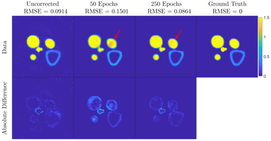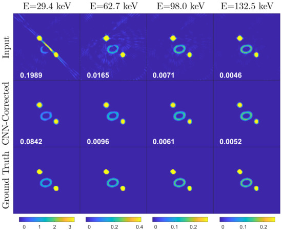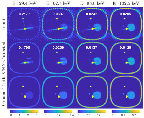 - Root Mean Squared Error ():where is the number of pixels in the ground truth () and CNN corrected () energy resolved reconstructions.